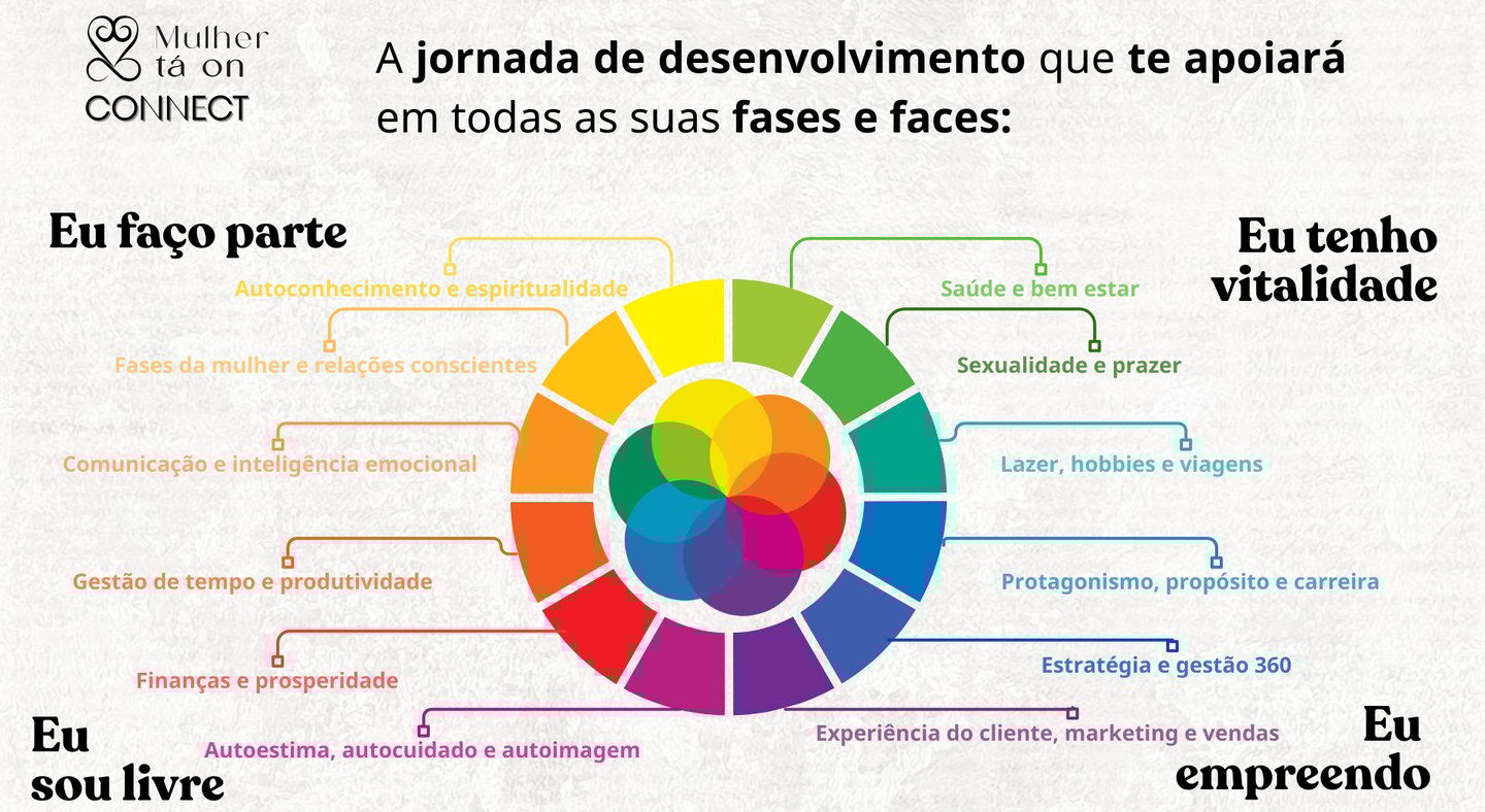Já o CONNECT é uma jornada completa de desenvolvimento: inclui mentorias, encontros exclusivos, visitas a empresas, materiais práticos, acesso ao Clube de Experiências e muito mais.